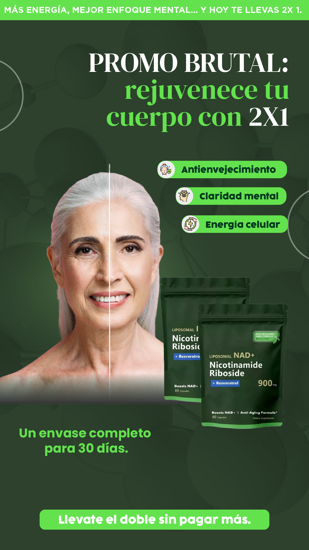NAD™ lo combate todo desde la raíz. Mejora la función celular, recarga tus mitocondrias y enciende tu mente. Aprovecha la oferta 2x1 y siente la diferencia desde los primeros días.